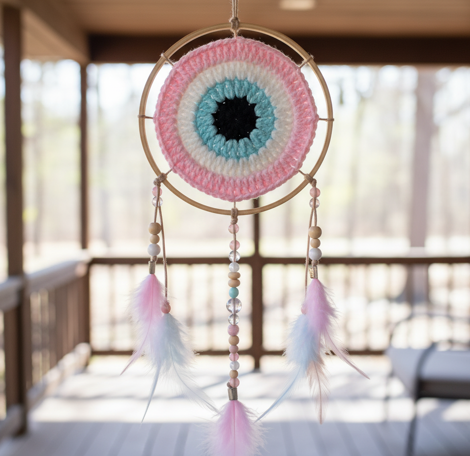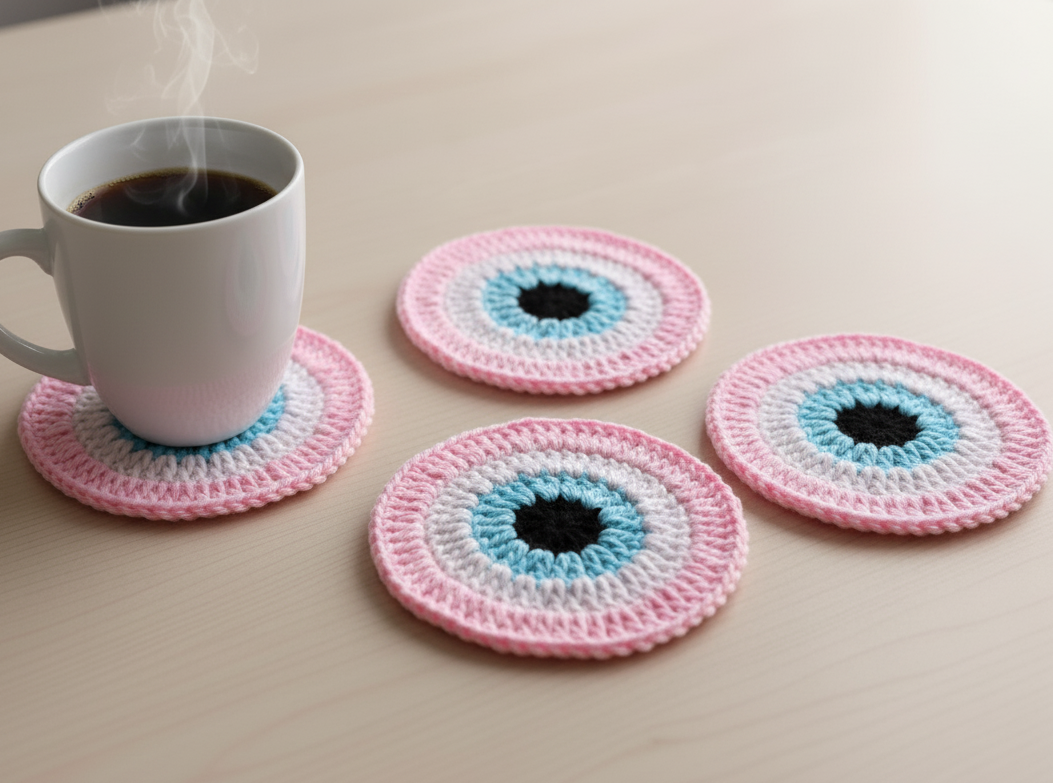 RITIKA CRAFT® Woolen Crochet Handmade Evil Eye Doily/Tea Coaster -3.75 Inch (Pack of 4) PINK